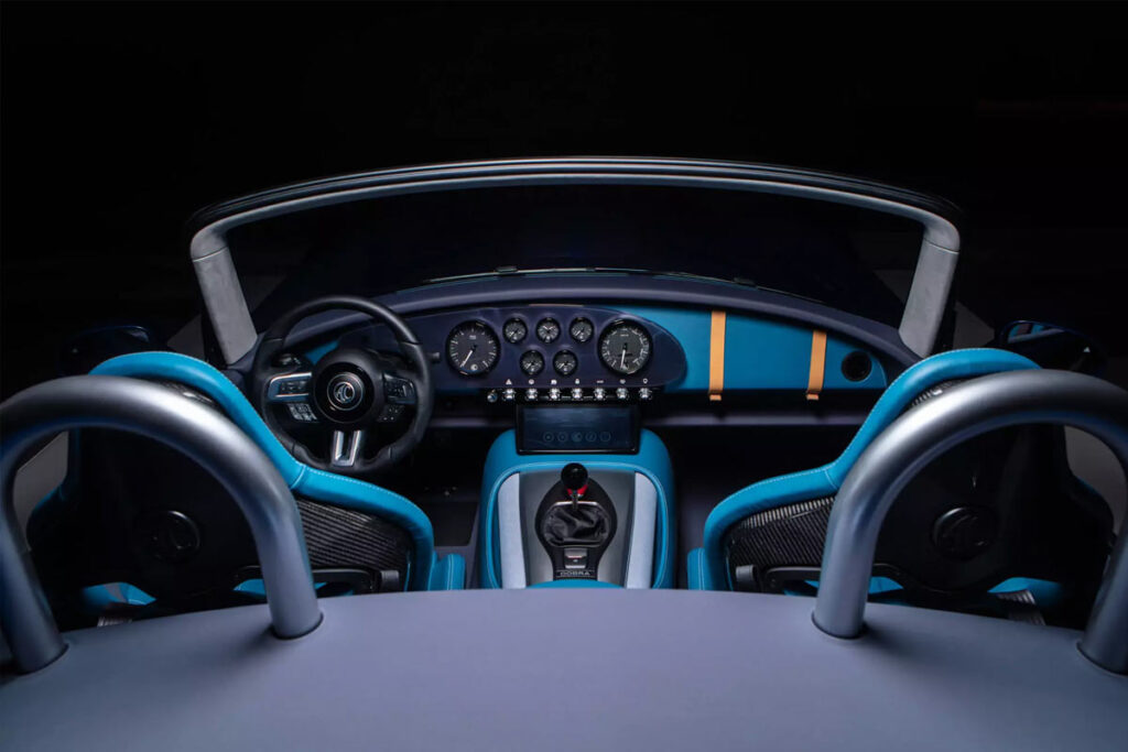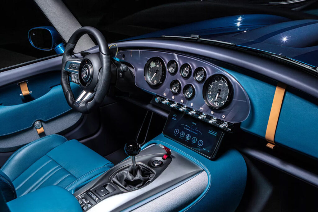 Eingebettet in einen Retro-stylishes Interieur blickt der Fahrer auf kreisförmige, sportliche Rundinstrumente und Ziffernblätter im klassisch gehaltenen Armaturenbrett. Ein LCD-Infotainmentcenter versorgt die Insassen mit allen wichtigen Features der neuen Cobra.