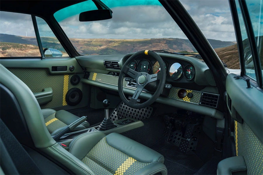 Auch der Innenraum wurde modifiziert, inklusive Carbon und Leder. Außerdem ist ein gut gemachter Restomod allemal exklusiver als bei der Erstauslieferung des 911er. Man(n) sitzt auf Recaro-Schalensitzen mit geflochtenem Leder und gelben Akzenten. Neben dem modifizierten Armaturenbrett samt Türverkleidungen, ebenfalls in grünem Leder, gibt es Bluethooth und eine kontaktlose Lademöglichkeit für das Smartphone. Auch an eine Rückfahrkamera wurde gedacht.